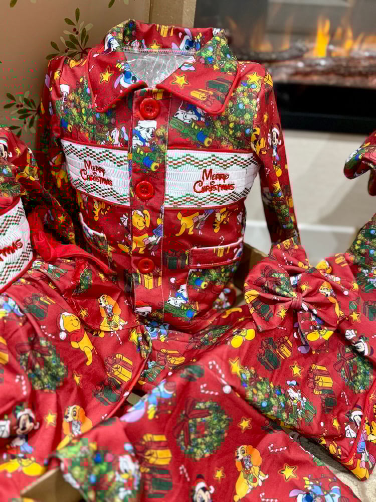 featuring an exclusive fabric designed by us with a mixture off classic Disney characters at Christmas. with matching smocking.