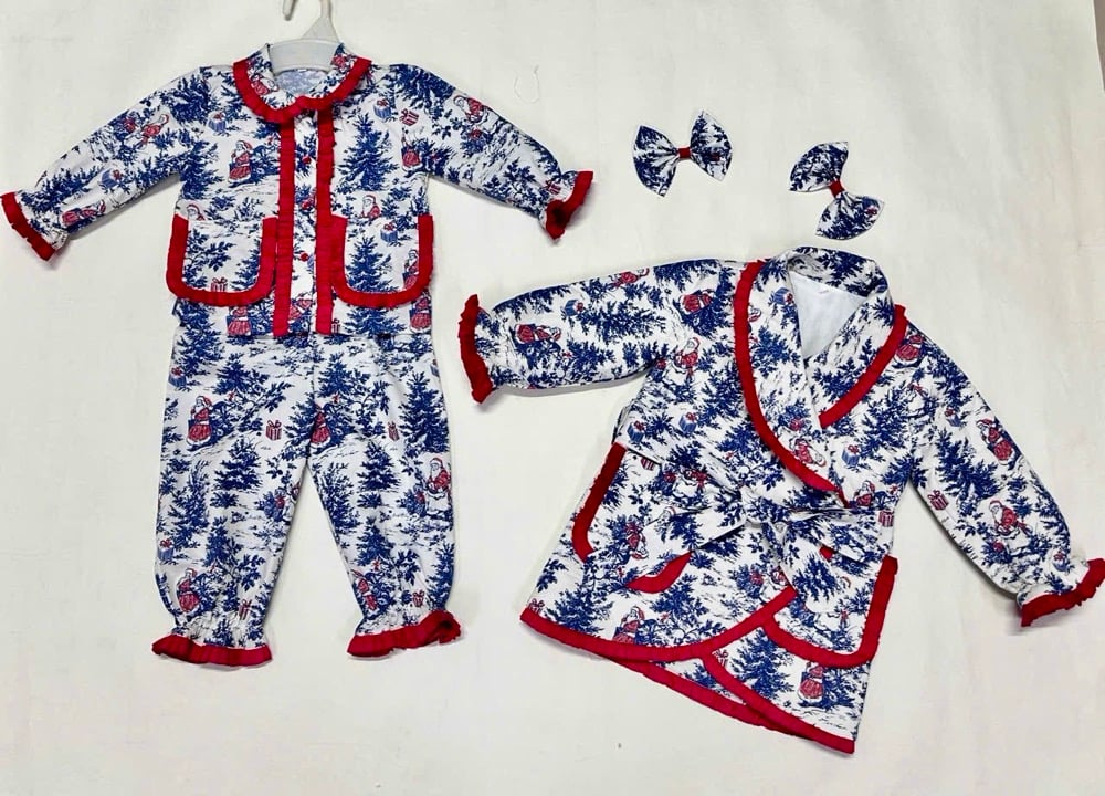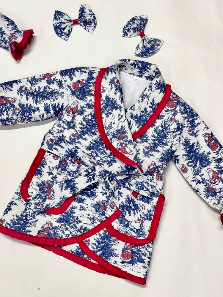 Complete set with matching quilted nightcoat in a custom Christmas toile fabric designed by us.