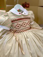 Handsmocked red /cream and brown smocking on front with ribbon detail.