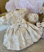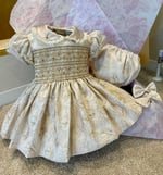 Matching handsmocked gold and cream smocking design with pearl bead embellishments. Gold organza frill around collar and sleeve.