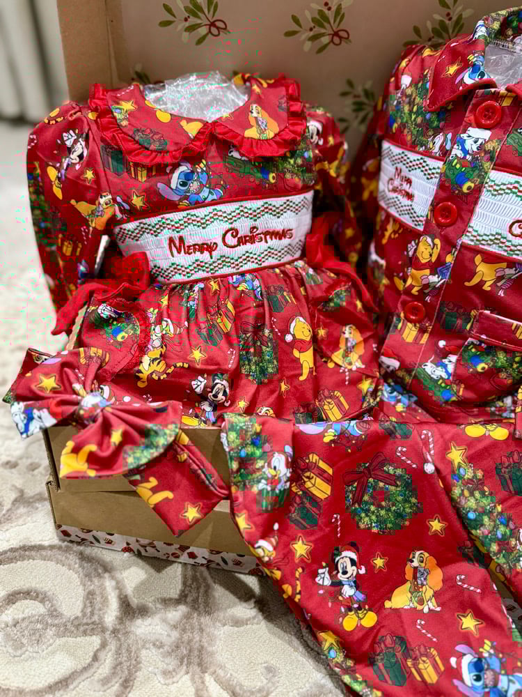 featuring an exclusive fabric designed by us with a mixture off classic Disney characters at Christmas. with matching smocking.